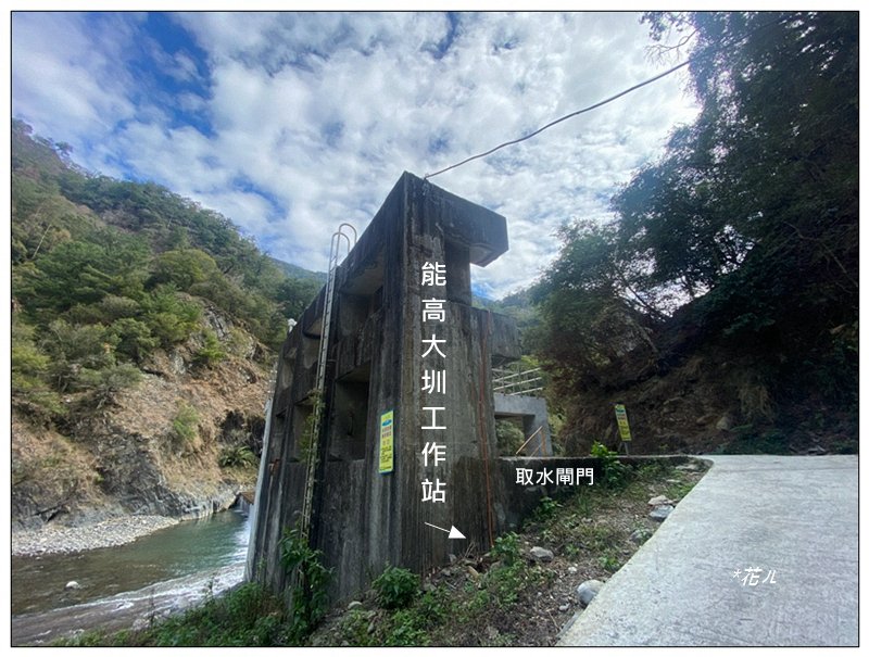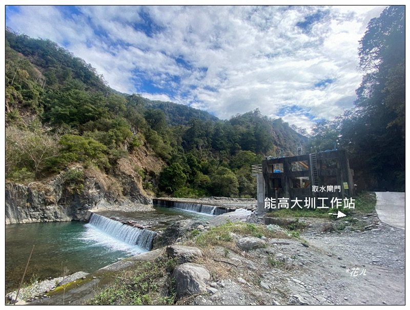 至最大瀑布後就見到北港溪溫泉露頭,再經三處攔水壩就到能高大圳工作站。