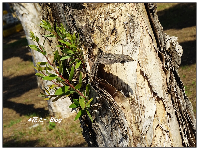 「白千層」灰白的樹皮有鬆軟觸感似如軟墊,自樹幹上層層剝裂因而得名。