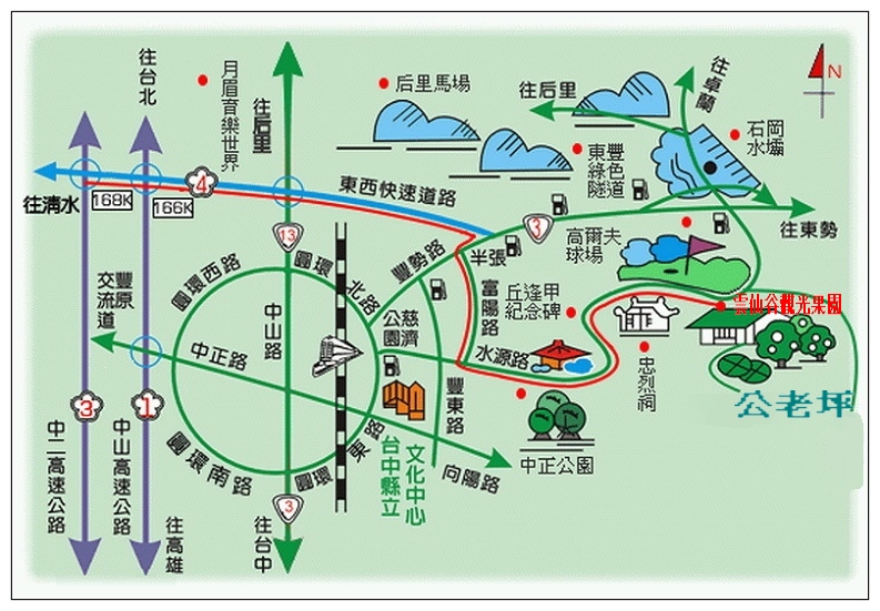<交通> 開車:高速公路下豐原交流道>中正路>水源路>公老坪>雲仙谷觀光果園。