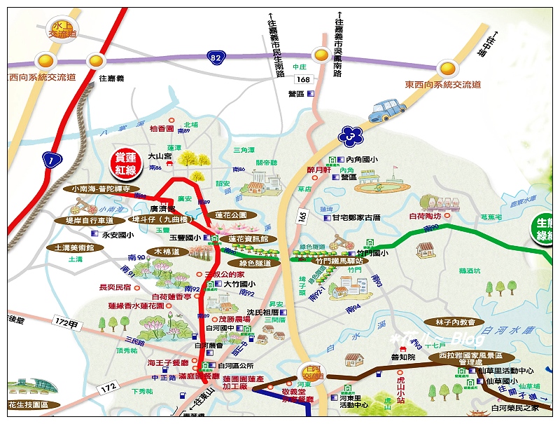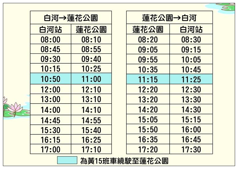 「白河至蓮花公園」假日有免費公車接駁,搭「賞蓮公車」輕旅行是不錯選擇。