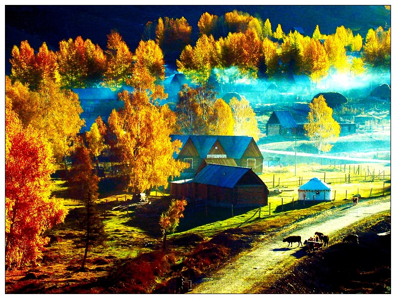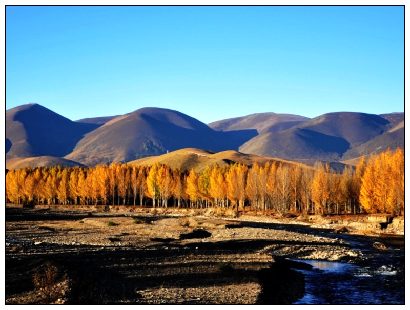 與河流相依相伴綿延不絕,就像條綬帶披掛在阿爾泰山的秋天裡。