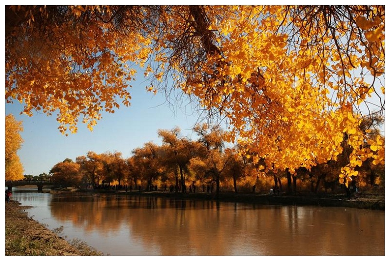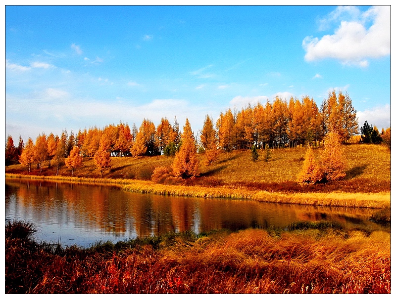 時而隨意地舒展在草地上。河兩岸的白樺樹,明亮的金黃色枝葉。