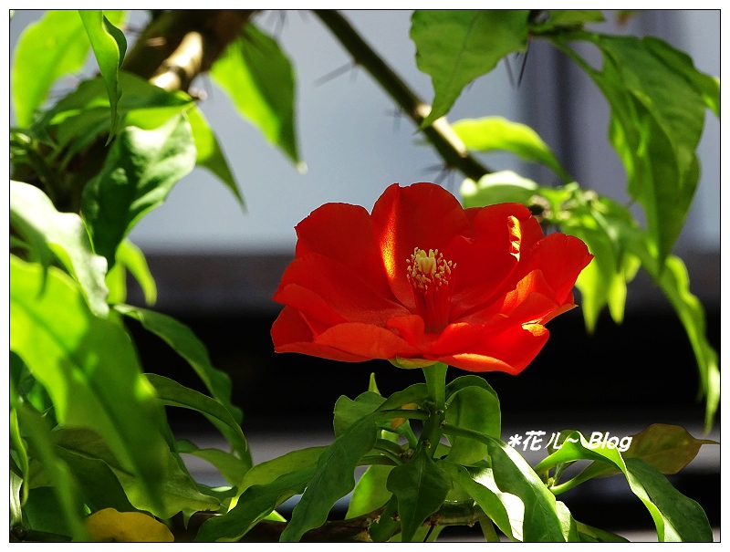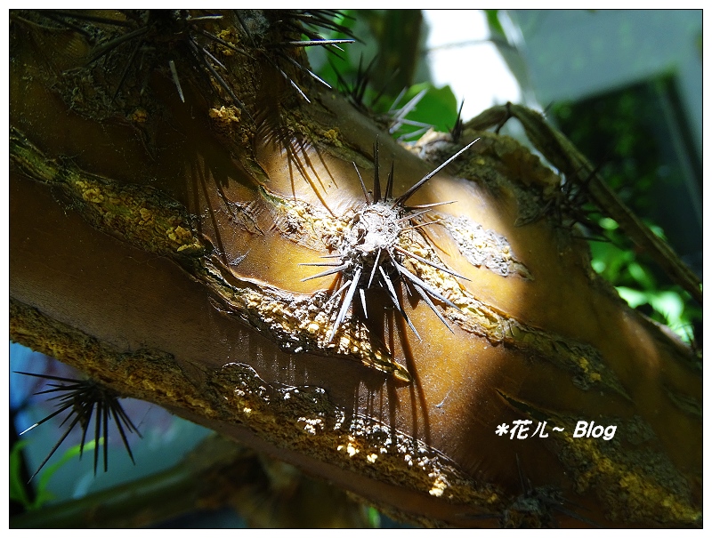它是仙人掌科木麒麟屬之植物,賞花者靠近它要小心莖上的長刺。