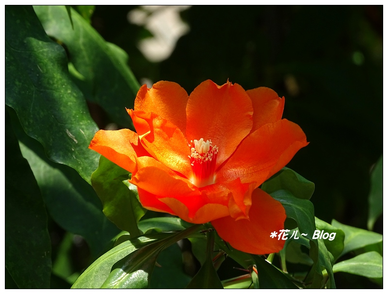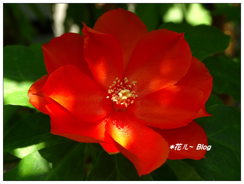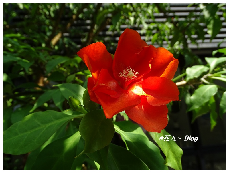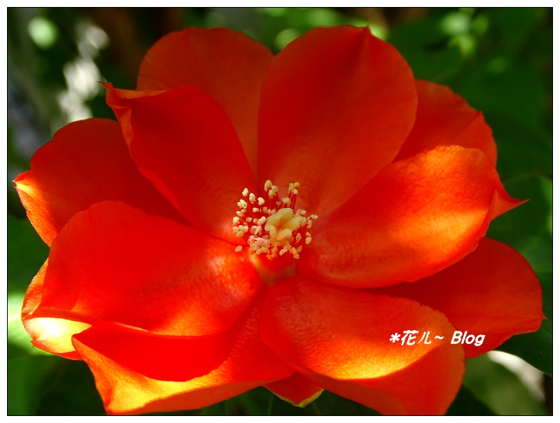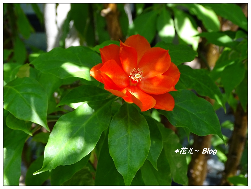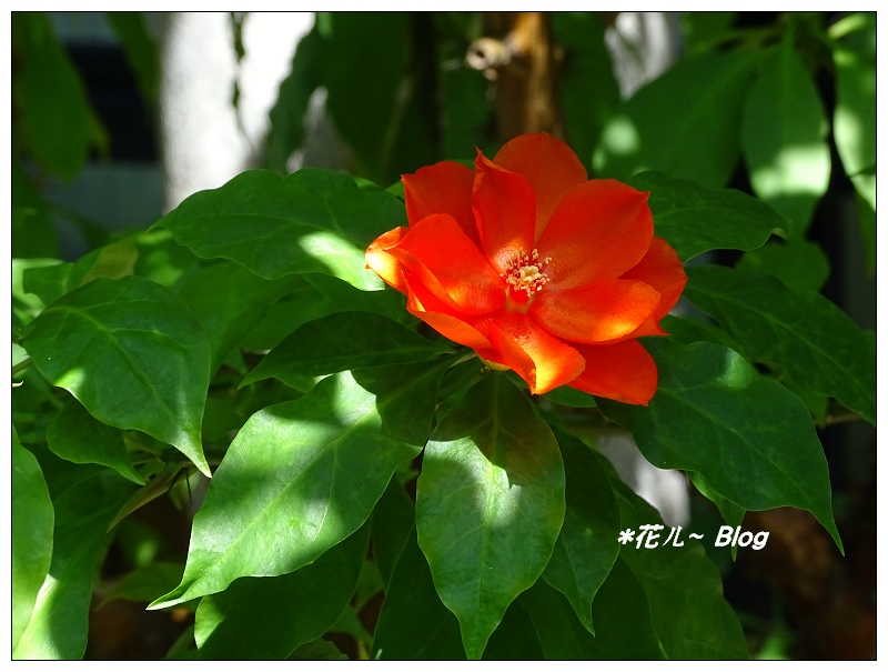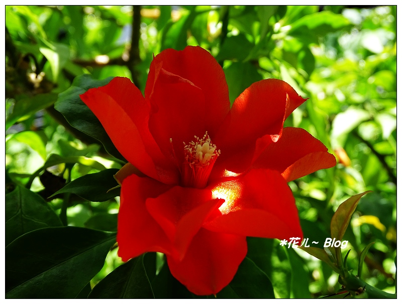 花的雌蕊被眾多雄蕊圍繞,紅橙色的花朵於陽光下非常豔麗。