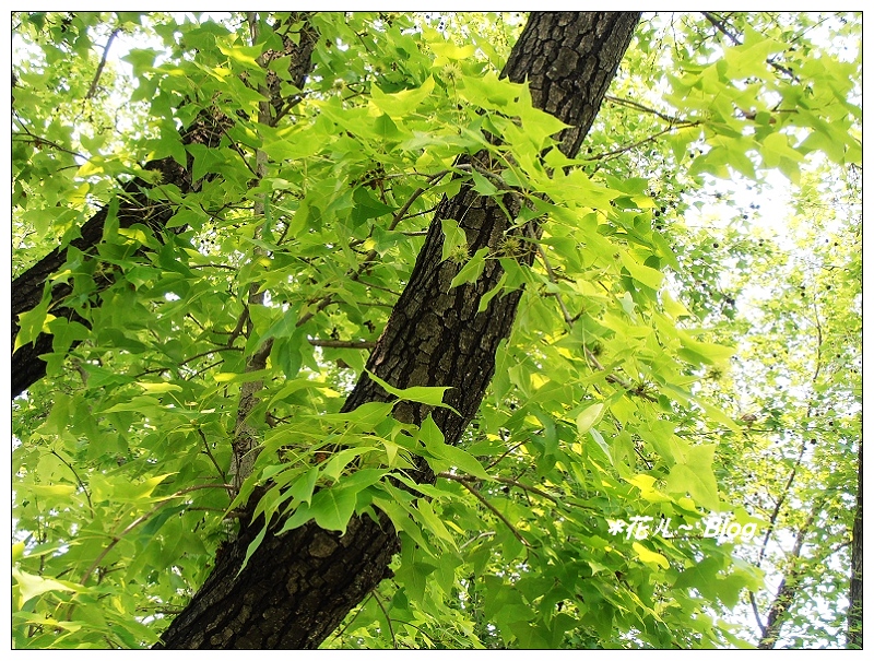 春天的楓香在陽光下顯得有股清晰翠綠的美感....台灣要俟秋冬楓紅美豔般景致不易。台灣位處亞熱帶,秋季落葉前平地氣溫仍高,楓葉不易轉紅,要俟寒流來襲時, 氣溫急速驟降, 葉綠素未能及時轉化為葉黃素和葉紅素。