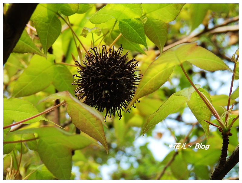 楓香的果實呈蒴果球形,聚合果相聚癒合成頭狀,外形似圓形小刺球黑褐色,徑約 2.5 公分花後花柱伸長成刺狀,先端裂開具 1~2 粒具扁平狹翅之完全種子,其他為不完全種子,完全種子有翅橢圓形長約 0.7 公分,不完全種子呈不規則稜角,徑約 0.1 公分花果期 3~9 月。