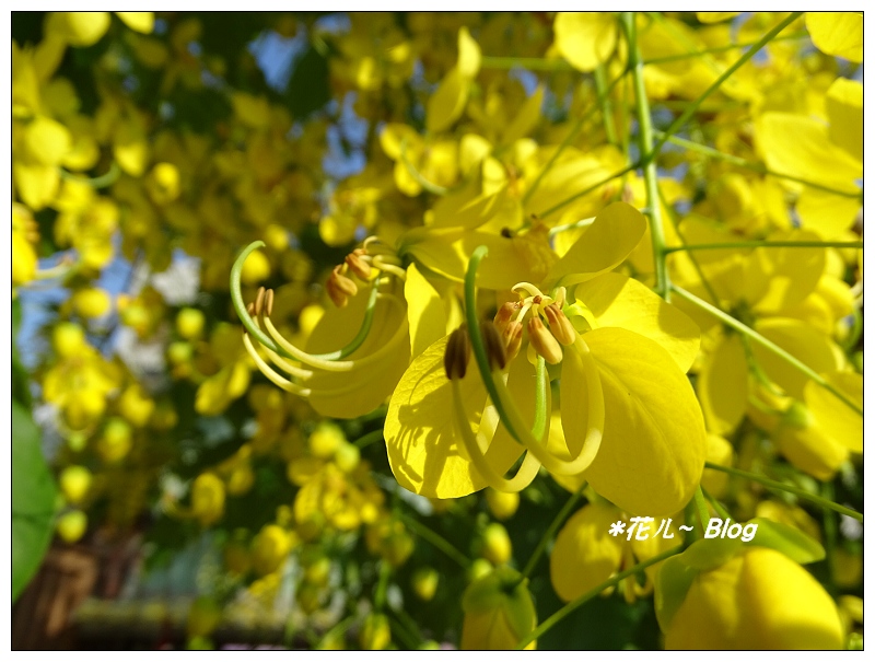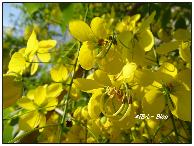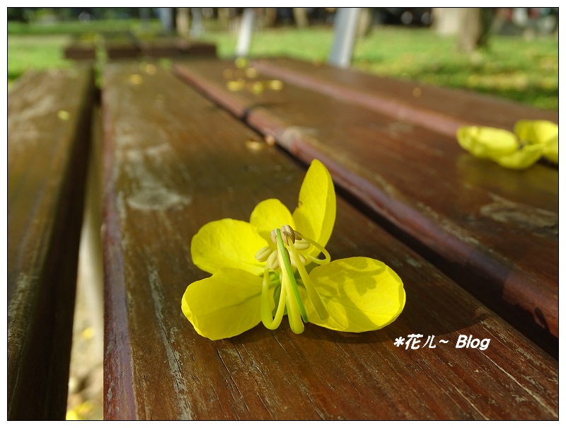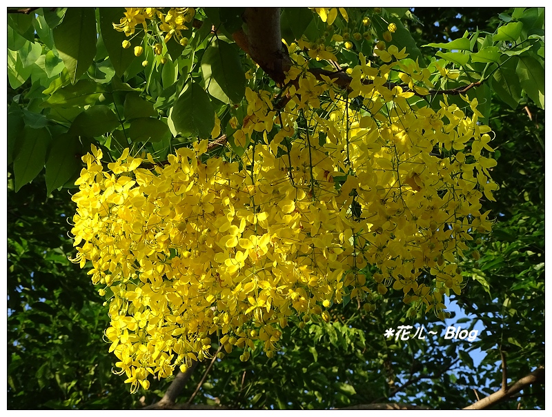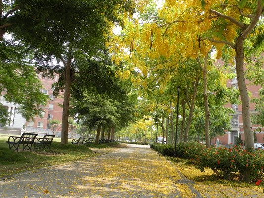五月份的阿勃勒黃花串串高掛於樹稍,似如鈴鐺般隨風搖曳,花落時如黃金雨般的情境。