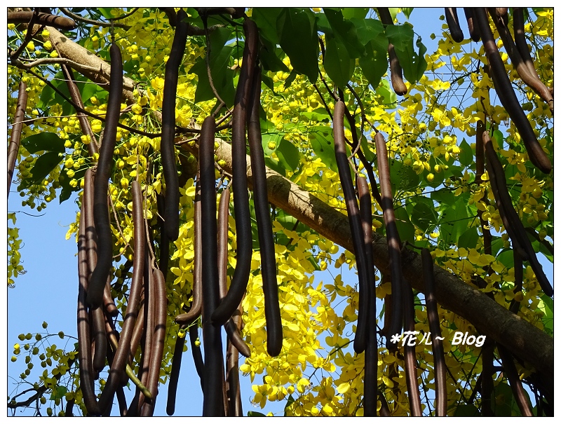 樹上還掛著長長阿勃勒果實像似一條條豬腸難怪有豬腸豆美稱。