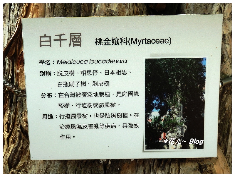 *花ㄦ 於 2013/08/11 16:53回覆謝謝分享 白千層的美 - 9樓. 我是google迷2013/08/11 12:35被你發現了白千層,中興大學在圓廳旁也有幾株,國光國小或國光路旁的那幾顆從小看到大,不過有1,2顆早卦點.我是沒被白千層引發過敏,倒是那個黑板木每年都會發出惡臭