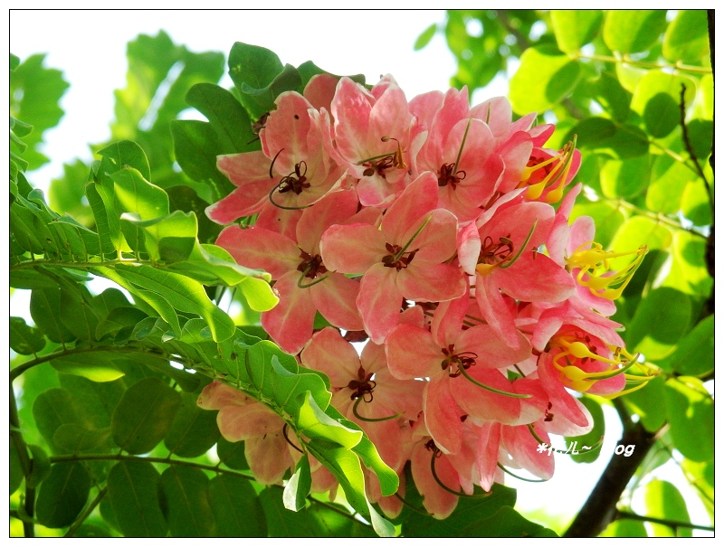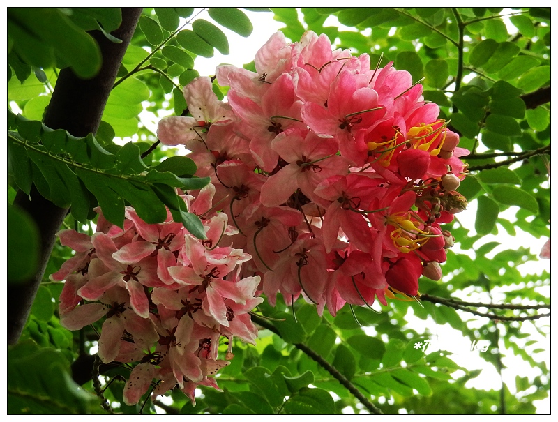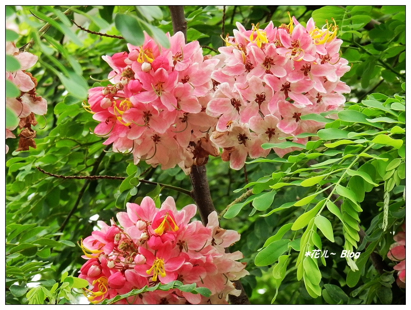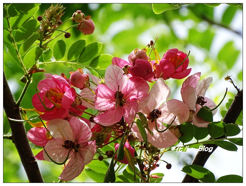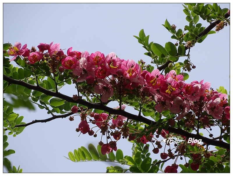 盛夏爪哇旃(ㄓㄢ)那花開似如日本櫻花般,粉紅彩裝增添炎夏的艷麗。