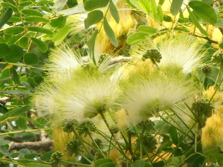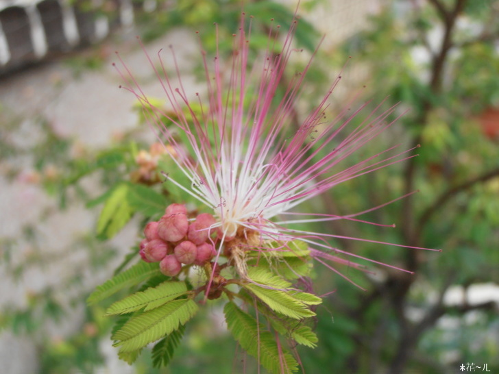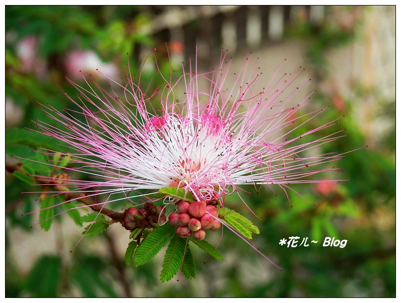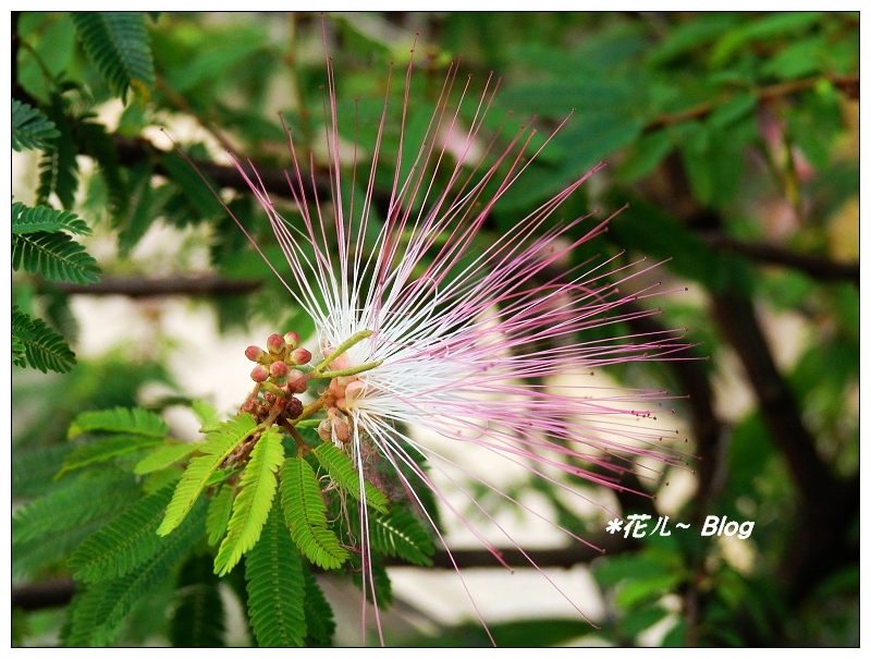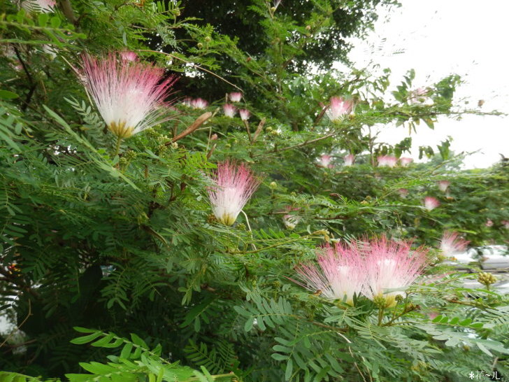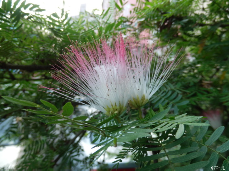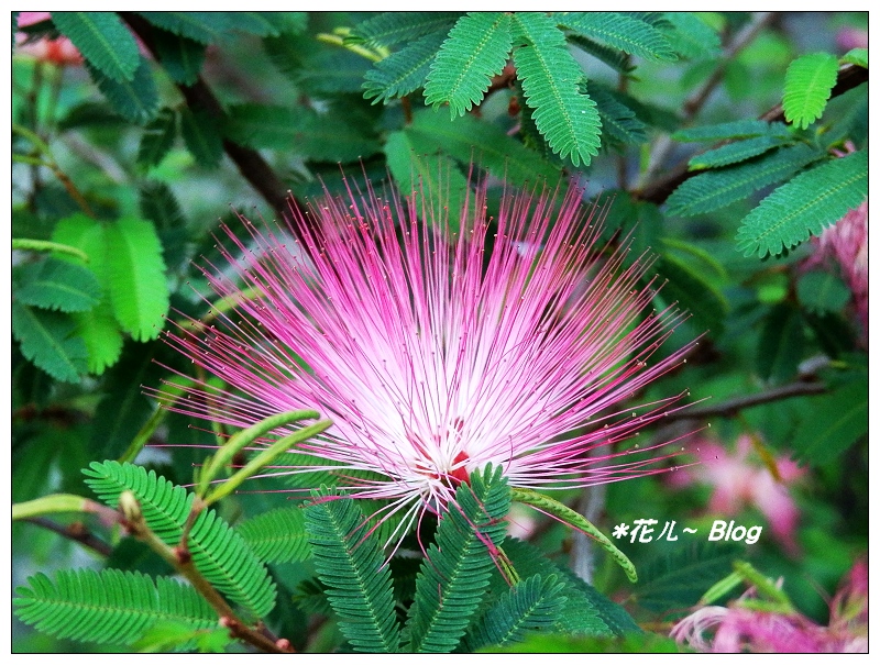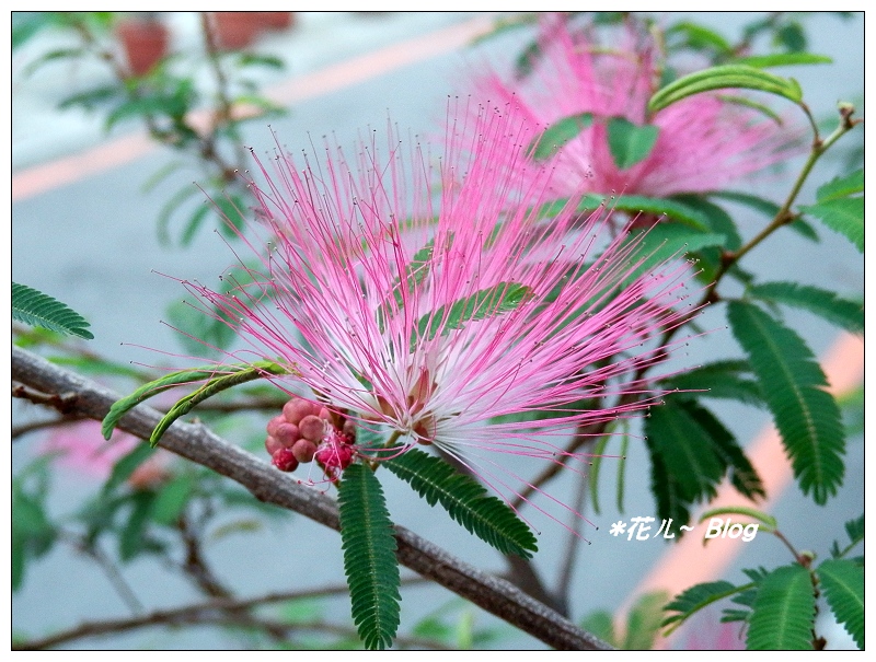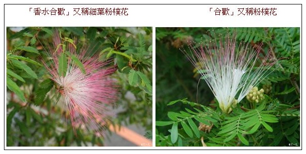 香水合歡的花絲色彩雖類似粉撲花,但花朵是白天綻放,線形小葉達 30~40 對,明顯細小。