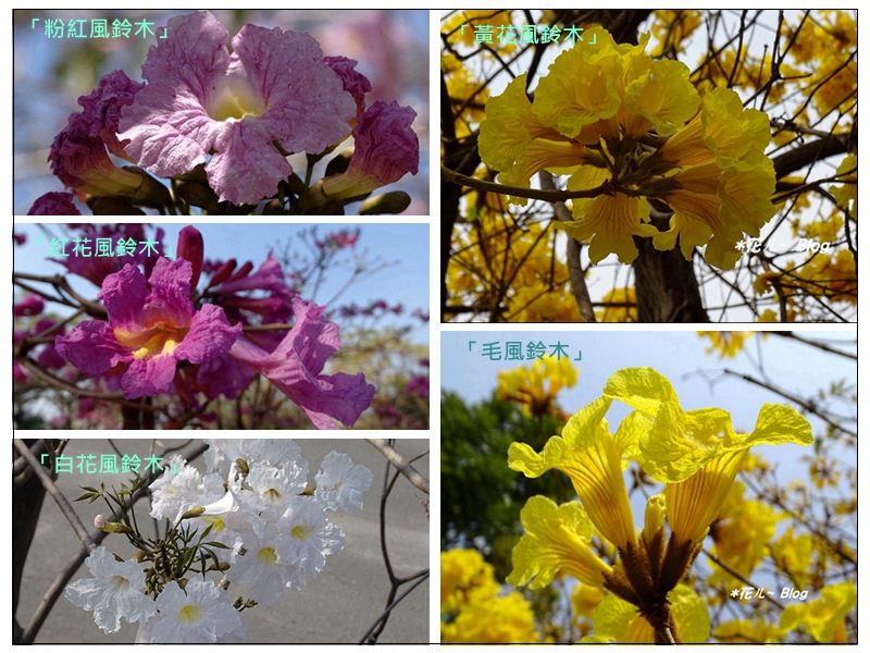 「紅花與黃花風鈴木」盛開時葉子會掉光,「粉紅與白花風鈴木」盛開時葉子不會掉光。