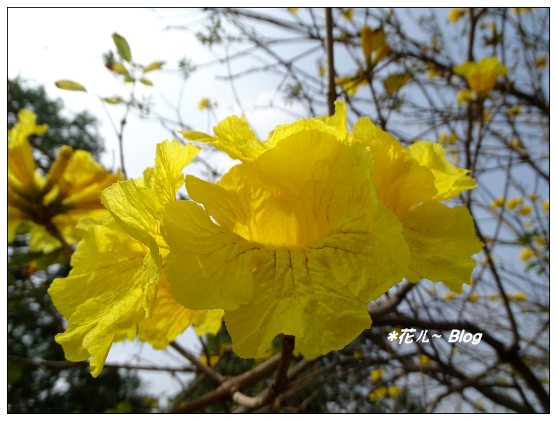 黃花風鈴木是中大型喬木(花開無葉),黃鐘花是灌木(花開有葉)。