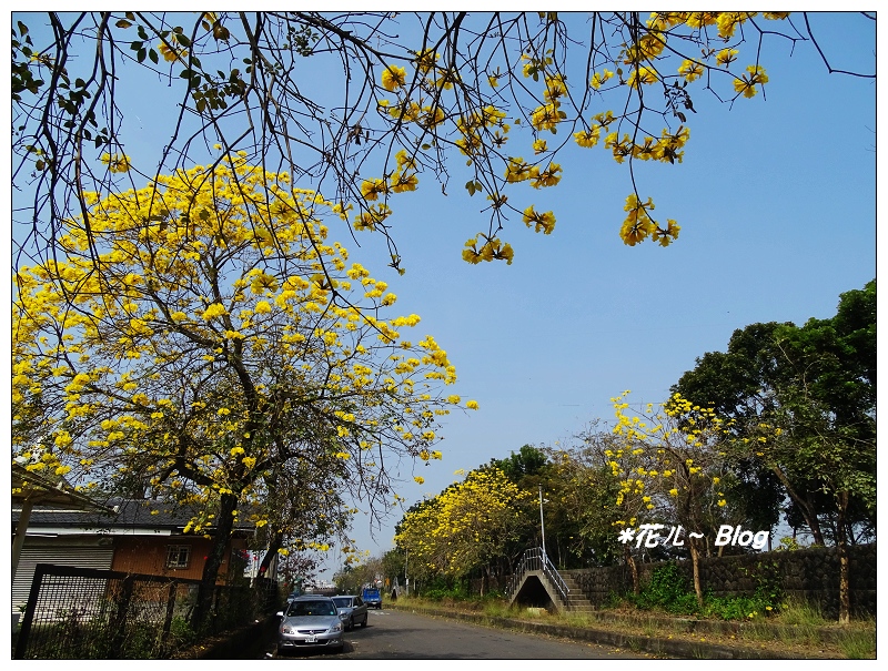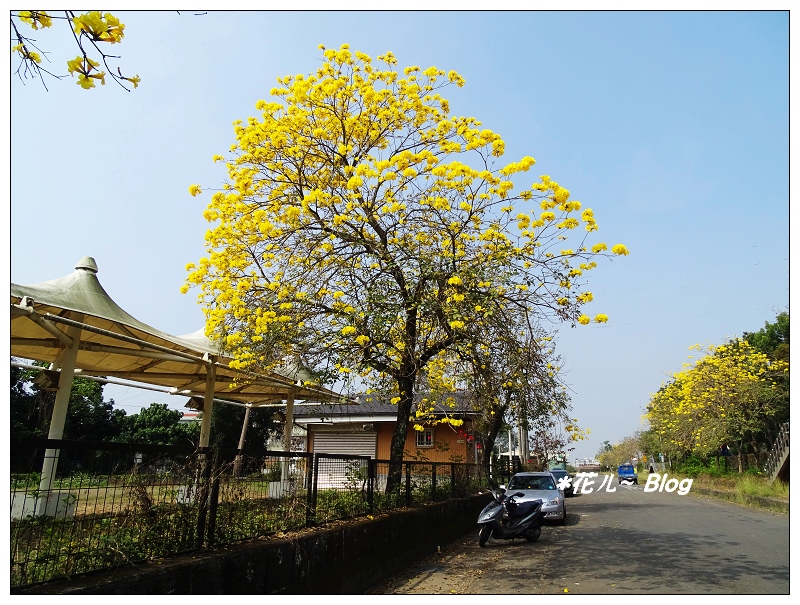 黃花風鈴木植於軍輝橋和忠義橋間堤防旁,花開季節若遇少雨期,會綻放的特別豔麗。