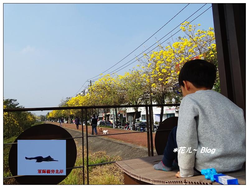 「軍輝橋」位於吳鳳南路上,<橋旁北岸>堤防旁有一整排的黃花風鈴木。
