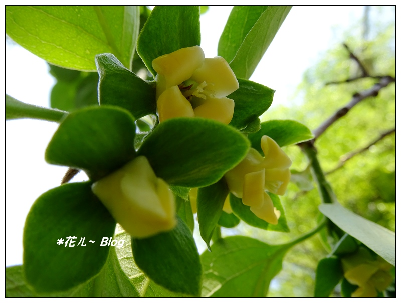 「筆柿」其花為黃白色,花瓣反捲四裂片,雄花萼小,不結果,一開花不久便掉落。雌花萼大,有如大肚子,不久便會結成黃綠色的果實。雌雄異株,幾棵雌株必須種一兩棵雄株才會結果。