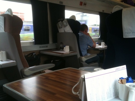 由於臨時才訂火車票,價格較貴,而且也只剩First Class車票(來回150鎊) , 我乘坐的火車早Coco乘坐的班次30分鐘抵達,First Class 車廂非常安靜,而且附贈免費咖啡或茶(可續杯),及瓶裝開水,由專人服務,車上也附簡單食譜,供旅客點餐用,座位旁也附有網路插座非常方便