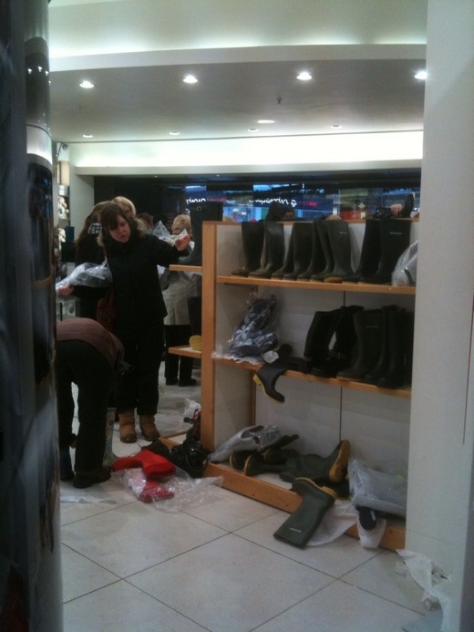 已將近兩週''雪花片片'',聽起來或許詩情畫意?然而,當局者卻是''苦不堪言'', 下雪前一天,還穿皮鞋上班,第二天改穿防滑的帆布鞋上班,一週後,雪越積越深,得改穿高統的Wellies 出門,這兩天各大百貨公司,賣的Wellies造成''購物潮'',每天都擠滿一堆人''搶購'',而有許多商家早已''斷貨''