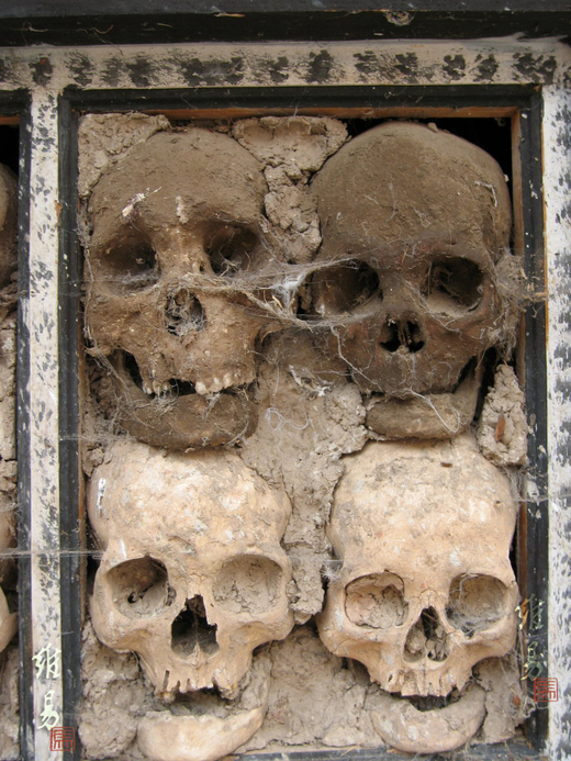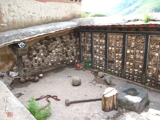 大著膽子,跟著僧人走進一間飄著腐肉味道的院子,一眼望去,三面牆砌滿了人頭骨,此時的空氣似乎都凍結了,膽子稍小的同伴,看了一眼就衝了出來,不敢再看下去了。