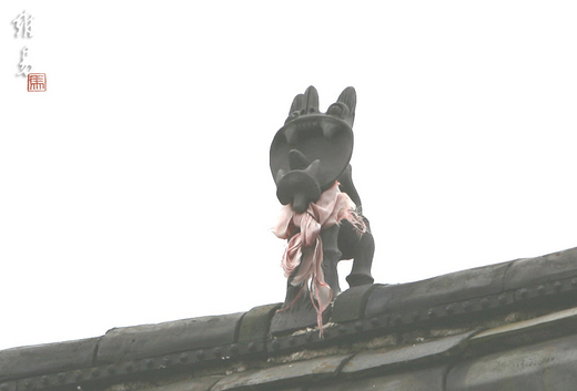 但是,到麗江的旅人們,您可曾注意過,蹲在灰瓦屋脊上的一隻怪貓?只是這隻貓咪長像不但不是惹人憐愛的那一型,反而是『張著大嘴、吐著舌頭、睜著雙眼、豎著兩耳、張著鼻孔、蹬著四腿、豎著尾巴』,一副隨時找人打架的模樣,怪嚇人的。