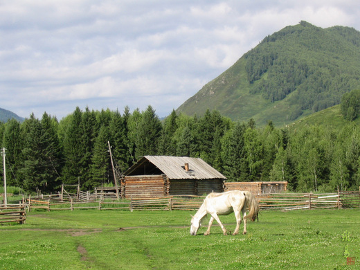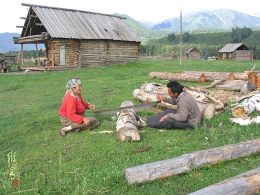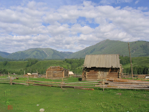 禾木村的房子全是用一根根粗粗壯壯未刨皮的原木堆疊起來的。屋頂有的是木板做成的金字塔形,有的乾脆用原木蓋成平頂,鋪上厚厚的土,讓屋頂長滿毛茸茸的青草,一副怒髮衝冠、現代龐克頭的有趣模樣。牆壁也是一根根未去樹皮的原木組合,木頭縫隙用土和乾草塞得滿滿而紮實。就連牲畜的棚圈,也一概用原木做成,既可以就地取材,也符合了山區多雨多雪的特色。