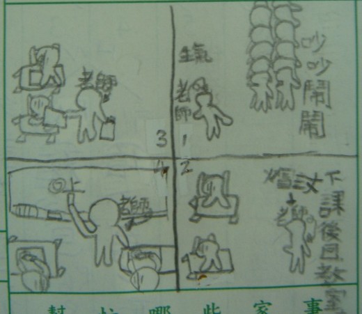 圖畫的內容在描述某一天我生氣的情景。因為學生排路隊吵吵鬧鬧,於是,