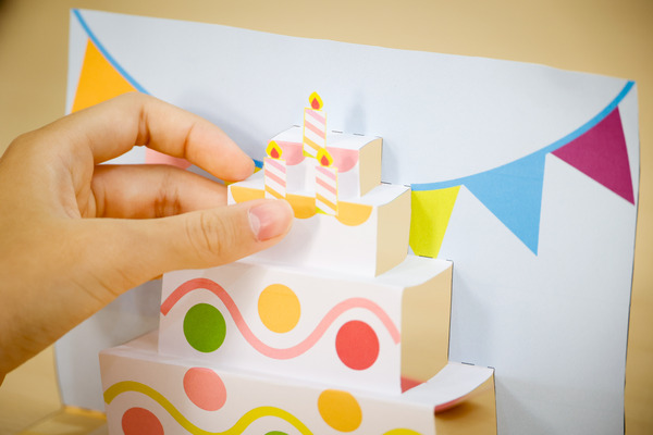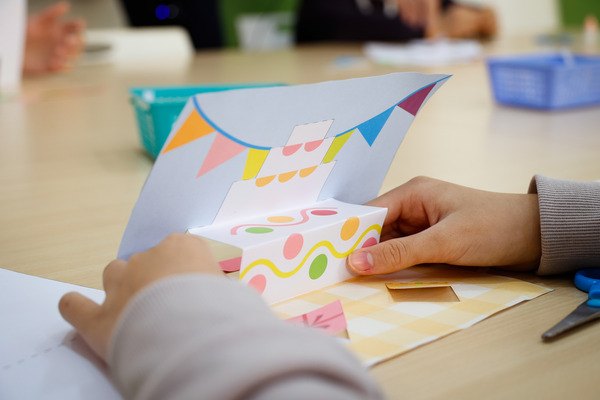 民遠老師用實物投影示範講解「摺要很小心、要對準」、「不要急慢慢來、線要壓實一點、摺實一點」。老師仔細又詳盡地說著,學生也很認真,跟著動手剪摺了起來。不一會兒,盒摺練習的蛋糕、爆炸的花園及千層的花朵躍然紙上,還有蠟燭、綠葉點綴,好不繽紛!
