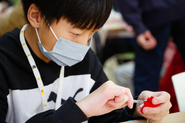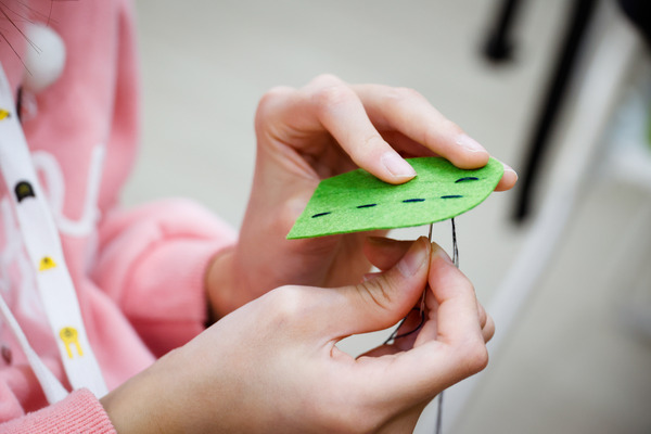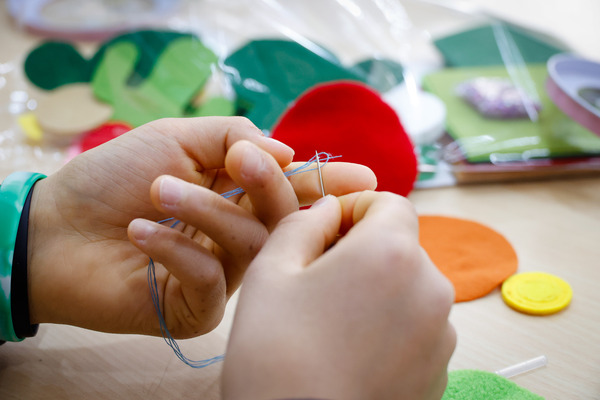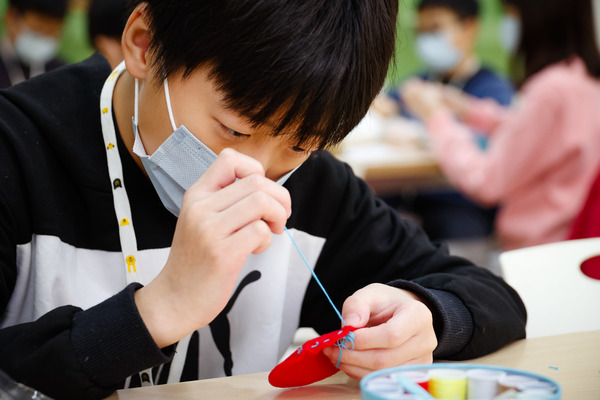 有了先備知識,接下來就進入正題縫製多肉植物囉。「先用熱消筆沿布點一圈」、「大家看我示範怎麼使用穿線器」、「平針縫就是一上一下直線上下縫」、「小心,不要刺到手了喔!」堯慧老師運用實物投影,讓大家看得仔細,還提醒用針安全,溫暖又貼心。今天也有一個帥哥小助教楷諺,兩位老師在旁指導,學生更能上手,本來大手打球拿起針線來,居然有模有樣變出好多花樣。