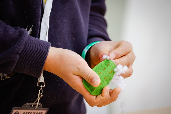 接下來就是塞棉花縫裝飾線進入最後階段。「軟綿綿的棉花好療癒啊!」翊瑄說著並露出舒服的笑容。只見本來扁扁的布胖起來變成小籠包樣、又變成仙人掌膨大的莖,最後熱融膠黏合,多肉植物完成囉!大家看到自己的作品,從無到有、從扁平到立體、單一到多彩,成就感油然而生。