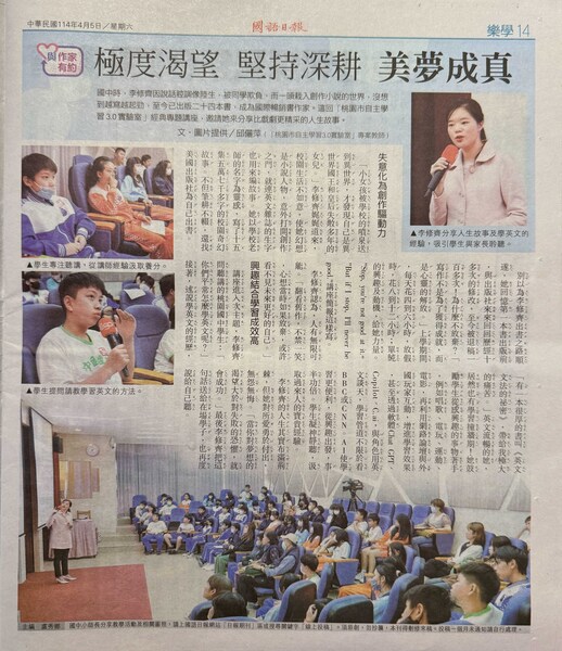 ▲國語日報刊登桃園市自主學習3.0實驗室經典專題講座