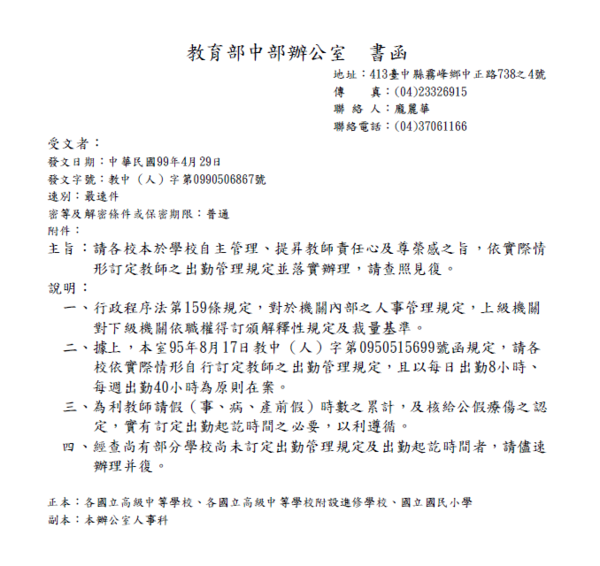 教育部早在民國99年4月29日教中(人)字第0990506867號函釋中闡明(註三):「請各校依實際情形自行訂定教師之出勤管理規定,且以每日出勤8小時、每週出勤40小時為原則」、「為利教師請假(事、病、產前假)時數之累計,及核給公假療傷之認定,實有訂定出勤起訖時間之必要,以利遵循」、「經查尚有部分學校尚未訂定出勤管理規定及出勤起訖時間者,請儘速辦理并復」。試想,若不訂定工時,怎麼知道請假累計時數是多少?出了意外,又要怎麼認定給或不給公傷假?足見,教育部要求各個學校訂工時,是有實際的請假時數累計及公傷假認定之需求。