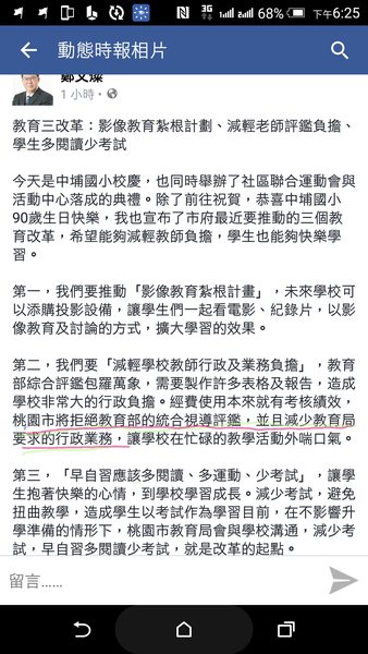 圖三鄭巿長臉書中宣誓:教育局要求學校的行政業務應減量