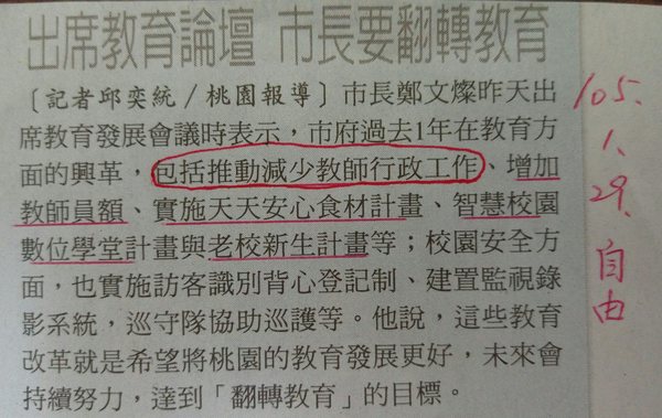 其實鄭巿長已經不只一次在自己臉書或報紙上宣誓,要減少教育局對學校的行政業務(如圖三、圖四)。看來這只是宣誓性質,真正的實踐,還需鄭巿長仔細體查巿府團隊有無落實行政減量政策。如這次新修訂的午餐評鑑與獎勵要點,就與鄭巿長「減少教育局要求的行政業務」政策背道而馳,進而引發各校蜂擁四起的民怨。