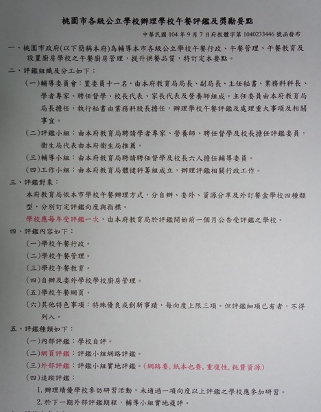 在104年新修訂的「桃園巿各級公立學校辦理學校午餐評鑑及獎勵要點」第三點明訂:「學校應每年受評鑑一次」及第五點明訂:「評鑑種類如下,網頁評鑑(評鑑小組網路評鑑)、外部評鑑(評鑑小組實地評鑑)」。網路評鑑,各校開始做網頁;實地評鑑,各校又要做紙本,等於同一件事重覆做2遍!而各校每年都要普查,算算一所學校依指標做成4大本,全巿高國中小共249所學校,一共要做249*4=996大本!網路評鑑+紙本評鑑,耗費時間、人力,而紙本資料厚厚近千冊,浪費資源又不環保;以往桃園的規定,連續2年獲得特優學校,隔年只要網路審查就行,新修訂的辦法,改成各校每年都普查,等於各校每年都要大拜拜一次!所以這學期常聽執行這項業務的老師或午餐秘書哭喊:「為了這個評鑑,忙了2個月,快崩潰了!」
