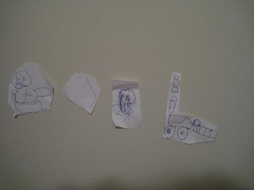 這是山頂洞人的壁畫嗎 ? 哈哈 ! 不對,這是我們家女兒多多最近在房間門口貼出來的公告 。 自從家中多出來一個女兒之後,在入夜之後兩個女兒就開始在睡夢中展開對話,剛開始的時候是小女兒定時在半夜一點哭到二 、 三點,好不容易媽媽把她哄睡了,又突然被姐姐突然之間的夢話或哭聲嚇醒,常常就這樣哭聲此起彼落一鬧到天亮,最後不得以只好實行隔離政策,把我的書房讓出來變成多多自己的房間,一方面可以訓練她的獨立自主的性格,另一方面可以把家中的亂源─多多的玩具─集中一個小房間,頓時之間客廳變得整齊許多 。 一開始多多很興奮地開始構思怎麼佈置房間,也歡迎小朋友和她的妹妹 Sophie 到她的房間裡玩 。 然而,在一次妹妹在她的房間裡大哭之後,多多畫了以上幾張圖貼在房門上,公布在她的房間可以和不可以的行為,以後別人要進入她的房間之前,必須先看過並遵守門上的規定才可以進來玩,以下是多多對這幾張圖的註解 。(由左往右、由上到下)