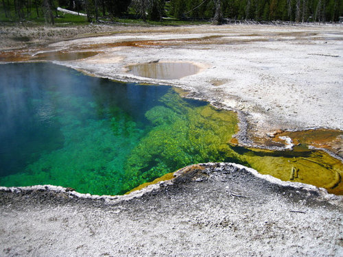 大部份的人對於溫泉都不陌生,但是黃石公園的溫泉顏色的豐富卻令人驚歎不已,地質和池內的細菌、藻類等微生物共同譜出七彩顏色的彩色溫泉。酸鹼質是決定水池顏色的主要因素,在無酸或微酸的水質中,藻類生長成黃色,加上水的藍色形成綠色,在高溫的酸性水質中藻類呈鮮綠色,在低一點的水溫中則形成橘橙色或是棕色。上帝用巧妙的物理原理創造了更多的色彩,當陽光照進池子裡時,光線被水中的微小物質散射,而藍色是可見光裡最容易散射的顏色,所以我們肉眼所看到的是藍色,如同天空是藍色的原理相同,加上池邊微生物的生長和岩石中分解出各色的礦物質,就形成了溫泉池中心的藍色被外圍的七彩所圍繞。例如,在「大稜鏡溫泉」(Grand Prismatic Spring)中,池面直徑達 115 公尺,水溫高達 86℃,它的色彩繽紛如同彩虹般的七彩色澤,七彩的池邊和池子中間那一大片深邃的藍美得難以形容。「西姆指噴泉區」(West Thumb Geyser Basin)位於黃石湖旁,溫泉中的嗜熱性細菌在這裡構成了藍、黃、紅、綠等色彩繽紛的溫泉和噴泉。