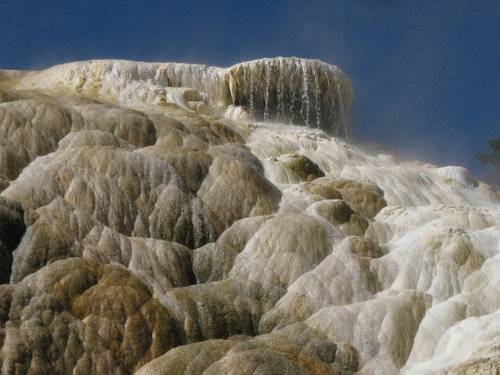位在黃石公園西北方的「長毛象溫泉」(或譯為猛獁溫泉Mammoth Hot Springs) 是一個十分特別的景點。它屬於石灰岩地形,溫泉從石灰岩中流中形成雪白和暗黃色的台階,有如梯田一般。自石灰岩層中湧出的熱溫泉將石灰岩中的碳酸鈣溶解於水中,當流出地表的水冷卻後,水中的碳酸鈣又凝結而沈積成石灰平台,平台中泉水中的藻類微生物構成黃、白、褐等色層層堆疊形成「石灰華階」。溫泉區內有許多大小不等的池子,由溫泉的泉水串連起來就像一連串不同形狀的珠珠,在彩色的池間和斷崖處還可以見到數十道梯形瀑布從岩坎上飛瀉而下,令人再次讚嘆上帝奇妙的手筆,可惜的是近年來溫泉的水源已經逐漸乾涸,昔日壯觀的溫泉瀑布到今日已經成為涓涓細流了。在長毛象溫泉山坡的底部入口處有一個著名的岩石柱「自由帽」(Liberty Cap),高度約十一公尺,它的形狀像法國革命戰爭時期愛國戰士所戴的帽子,它是經過多年熱溫泉活動逐漸冷卻、乾涸所堆積而成的岩石柱,成為到長毛象溫泉必定要留影的景點。