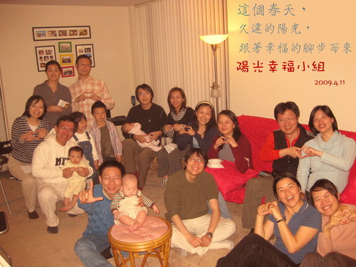 在決定大方向之後,大家開始分頭進行宣傳和邀請的工作,第一次的"陽光幸福小家"聚會在2009年4月11日,有包括我們在內的八個家庭參加聚會,聚會的形式是一開始是大家分享由各家帶來的美味佳餚(在美國稱之為potluck),在享用完美食之後,有一段用詩歌來感謝讚美神的時間,接下來是關於聖經或是家庭的主題分享,由我們三對基督徒夫婦輪流主領。第一次的聚會主題是"第一次的神蹟",藉由耶穌在婚宴把水變酒的故事,主領的夫婦告訴我們耶穌關心、在意我們的危機,當我們的信心預備好時,就是我們經歷神蹟的時刻。陽光幸福小家十分受到上帝的祝福,在鄰近地區許多學生夫婦都陸續加入了聚會,我們也成為這個社區的生命共同體,除了每三週一次的聚會之外,日常生活中經常彼此探訪,小組中的家庭主婦們建立起陽光幸福小家的聯繫網路,在這個網路之中不時有剛烘焙好的糕點、新發明的菜餚和打折的消息在各家中流傳,每個家庭在到Costco和東方超市買菜之前會先想到其他家庭是否有代買的需要,當有家庭誕生了新生命,陽光幸福小家的主婦們主動安排了一份送餐時間表,一同分擔在坐月子期間的辛勞。在這二年當中,陽光幸福小家成為這個社區的祝福,我們一同渡過留學生活中的歡樂與淚水,也一同經歷了上帝在這個社區中的奇妙作為,願祂的愛透過陽光幸福小家流傳到湖北村的每一戶人家。
