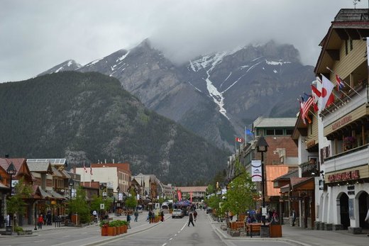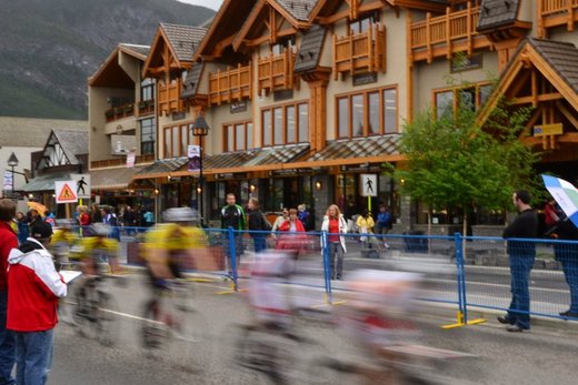 在數小時崎嶇起伏的舟車勞頓之後,終於到達了名聞遐邇的班夫鎮。班夫鎮是加拿大洛磯山脈最早建立的城鎮,被群山所環繞,以北方的卡斯喀山(Cascade Mountain)為背景的街道是班夫最著名的地標。”卡斯喀”的原文是瀑布的意思,在冬天的時候山上堆積著靄靄的白雪,夏天融雪之後,光禿禿的山陵只剩下冰河切割的遺跡。班夫鎮的主要道路是班夫大街(Banff Ave),三百公尺左右的街道上十分熱鬧,到處都是精品店、餐廳、博物館和旅館,儘管許多商業活動進駐,班夫鎮的景觀仍保持十九世紀的建築特色。我們到達班夫鎮的時候,適逢小鎮舉行自行車大賽,加拿大是一個相當熱衷推廣自行車運動的國家,在班夫國家公園周圍的公路都另外闢有自行車專用道路。雖然班夫鎮的規模不大,要完全走完班夫鎮周圍的景點至少要花二天的時間,我也將用三篇遊記來細細描述班夫的美景。