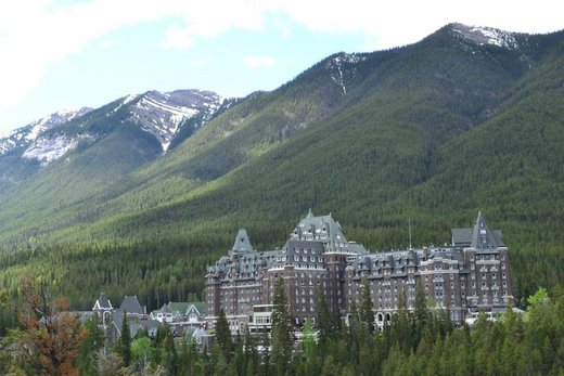 沿著瀑布一側的台階往上走就是班夫最著名的班夫溫泉城堡飯店(Banff Springs Hotel),這間古典歐式城堡的建築座落在一大片針葉林中,古樸的建築石材加上氣派宏偉的設計彷彿置身於中世紀的古堡,這間城堡飯店是班夫最早的旅館之一,在鐵路工人發現班夫溫泉的五年之後於1888年所興建,在1992年被列為國家古蹟。1953年瑪麗蓮夢露拍攝大江東去的時候即住宿在這間飯店,有一次在弓河附近不慎扭傷了腳,幫夢露推輪椅瞬間變成飯店人員最搶手的工作,甚至最後要付費才能得到這份殊榮。由於城堡建築十分雄偉並座落在山腰,在城堡附近無法抓到最好的拍攝角度,最佳的拍攝地點在弓河對岸公路的轉角懸崖旁,班夫國家公園也很貼心地在這裡設立一個瞭望台,讓遊客可以盡情地留影。