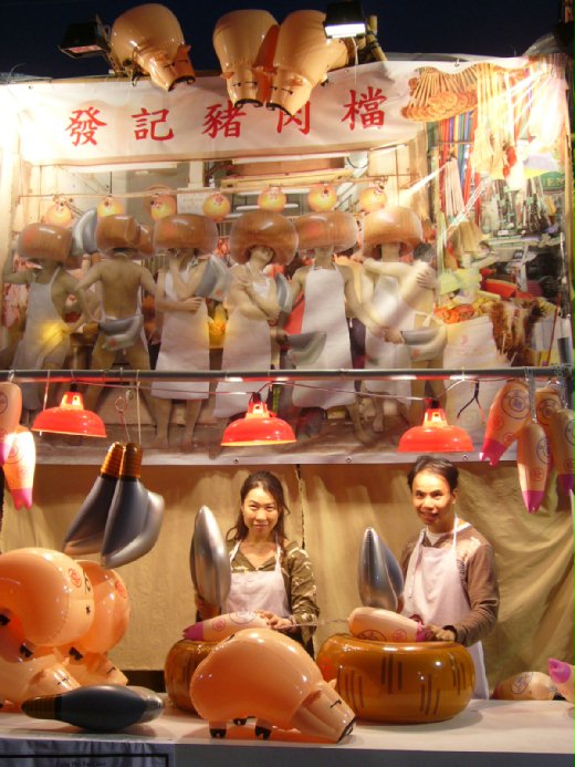 (頁首所示圖片是我認為全場最具創意的檔位。檔主就地取材,利用別家檔位所賣的創意產品融入自己的構思中,讓客人於影棚任意扮演「豬肉佬」。客人可自選3個不同姿勢,拍照後更可馬上拿走光碟。只需港幣28元,實在抵玩!)