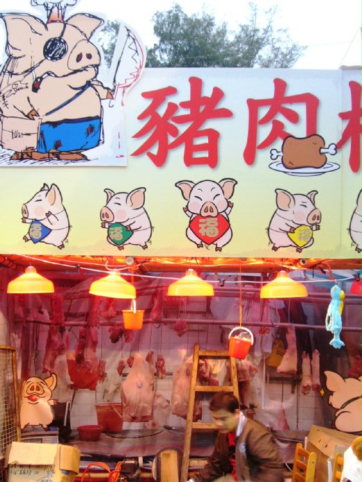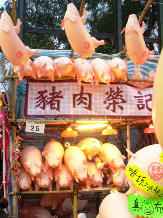 小夫,沒錯,那都是吹氣的豬,不能作餐。其實第三幅圖所示的檔主,也是賣一頭頭不會叫的吹氣豬啊!