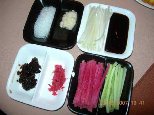 當然, 一隻鴨是一定要的,搭配的有鴨三件,鴨掌,鴨肝什麼的,店家每人面前都擺著搭配吃烤鴨的沾料,有六樣,醬,黃瓜,心裏美(桃紅色的蘿蔔),顆粒白糖,蔥等,但卻陸續先上其他的菜,等到最後才上烤鴨.