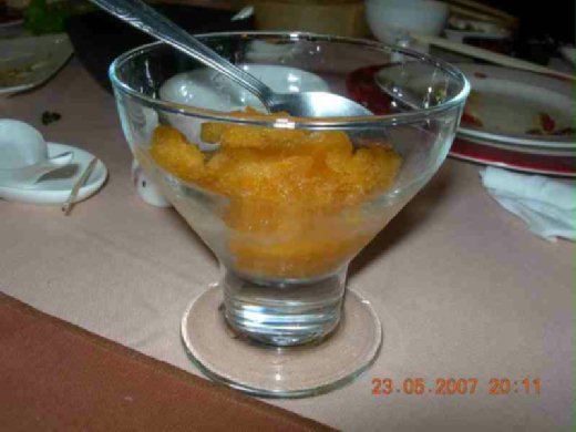 不一會兒,端來五個高腳杯,裏面裝著黃澄澄的冰沙,小湯匙舀一點放在嘴裏,不怎麼甜,很濃的杮子味. 問女侍(大陸人叫服務員,可千萬不能叫她小姐)這是啥東西?