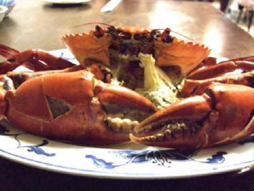 在等候空檔,看到櫃台擺了兩隻剛蒸好的大螃蟹,店家說是沙公,一隻650, 一隻750元. 心想,上回在喜來登辰園,吃了一隻20兩重的大沙公,跟這隻差不了多少,竟要2000元.相較之下,田園這裏太划算了.就要了一隻750的.