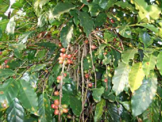 喝罷,店主帶我們到後面參觀咖啡樹園,由於才收成過,樹上豆子所剩無多,但仍可看到一纍纍的紅豆子. 店主要我們自已摘豆子回去種.我們好高興,摘了數十顆帶回家.