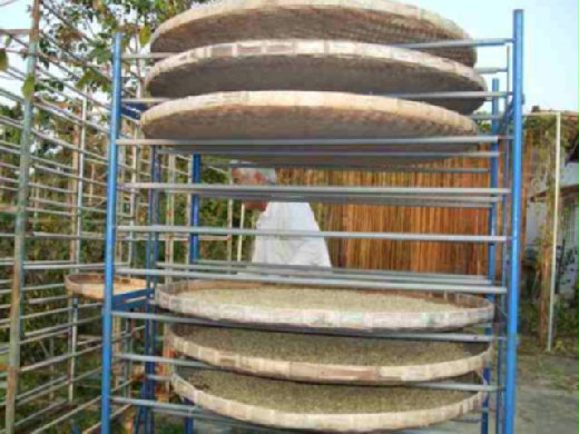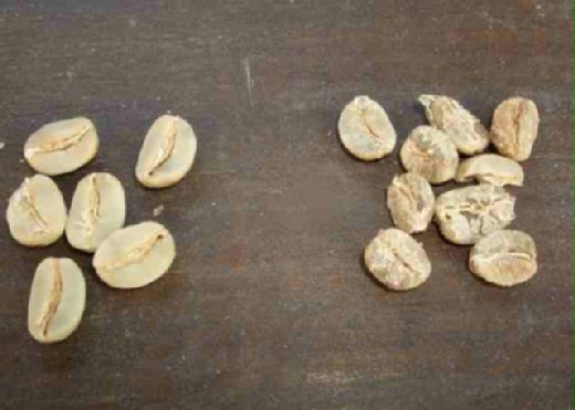 店主的父親正在後院晒咖啡豆,好幾籮筐的豆子. 店主說,豆子晒乾後,還要揀選,把不良品剔除. 我們拍下良品和不良品的豆子,以做比較,真是一目了然.