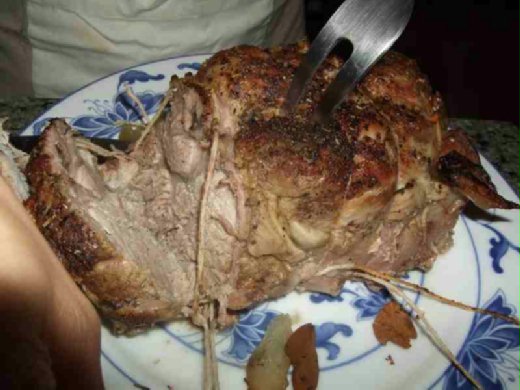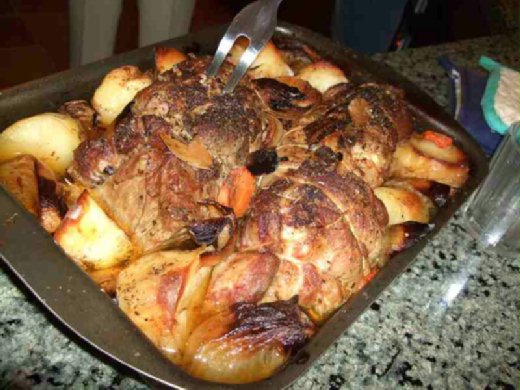 1. 肉用細繩綁起(約每隔三五公分纏繞.) 肉上抹鹽和胡椒粉, 置入烤盤,肉四周擺滿去皮切塊的馬鈴薯和洋蔥,幾片月桂葉