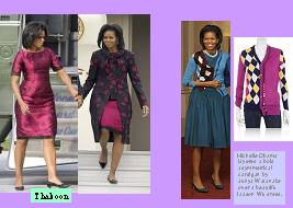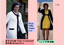 蜜雪兒則穿著THAKOON 設計的2009年秋季新裝--紫紅藍花套裝,裏面是艷紫紅,外套是藍紫紅.