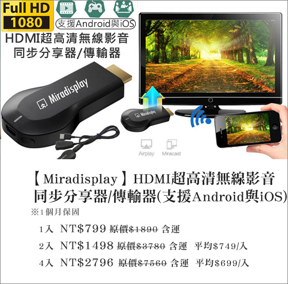 購買的網址在這裡---Miradisplay-HDMI超高清無線影音同步分享器/傳輸器(支援Android與iOS)